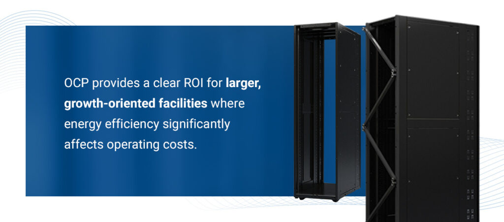 OCP provides a clear ROI for larger, growth-oriented facilities where energy efficiency significantly affects operating costs. Hyperscale data centers see measurable savings in cooling and power distribution. Plus, the front-access design reduces service time in high-density environments.